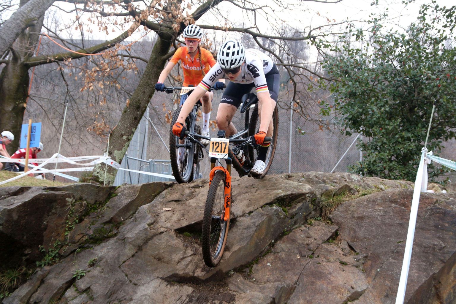 Zusammen mit dem Junioren-Nationalkader hat unsere Fahrerin Rosalie Sporn an der Tamaro Trophy, dem Auftaktrennen des Swiss Bike Cup in Rivera/Monte Tamaro im Tessin teilgenommen. Den Wettkampf auf der Strecke, die als eine der technisch anspruchsvollsten in der Schweiz gilt, nutzen jedes Jahr viele Top-Fahrer:innen als einen der ersten Formtests für die beginnende MTB-Saison. In diesem Jahr war das Rennen zusätzlich attraktiv für diejenigen, die sich eine Teilnahme an der EM im Sommer auf derselben Strecke erhoffen. Entsprechend groß und stark waren die Fahrerfelder in den unterschiedlichen Altersklassen. In der weiblichen U19 gingen knapp 50 Fahrerinnen an den Start und kämpften um wertvolle Punkte im Rahmen der UCI XCO Junior Series. Erschwert wurde der Wettkampf durch den Regen, der in der Nacht gefallen war und die felsigen Passagen rutschig machte – zahlreiche Stürze waren die Folge.