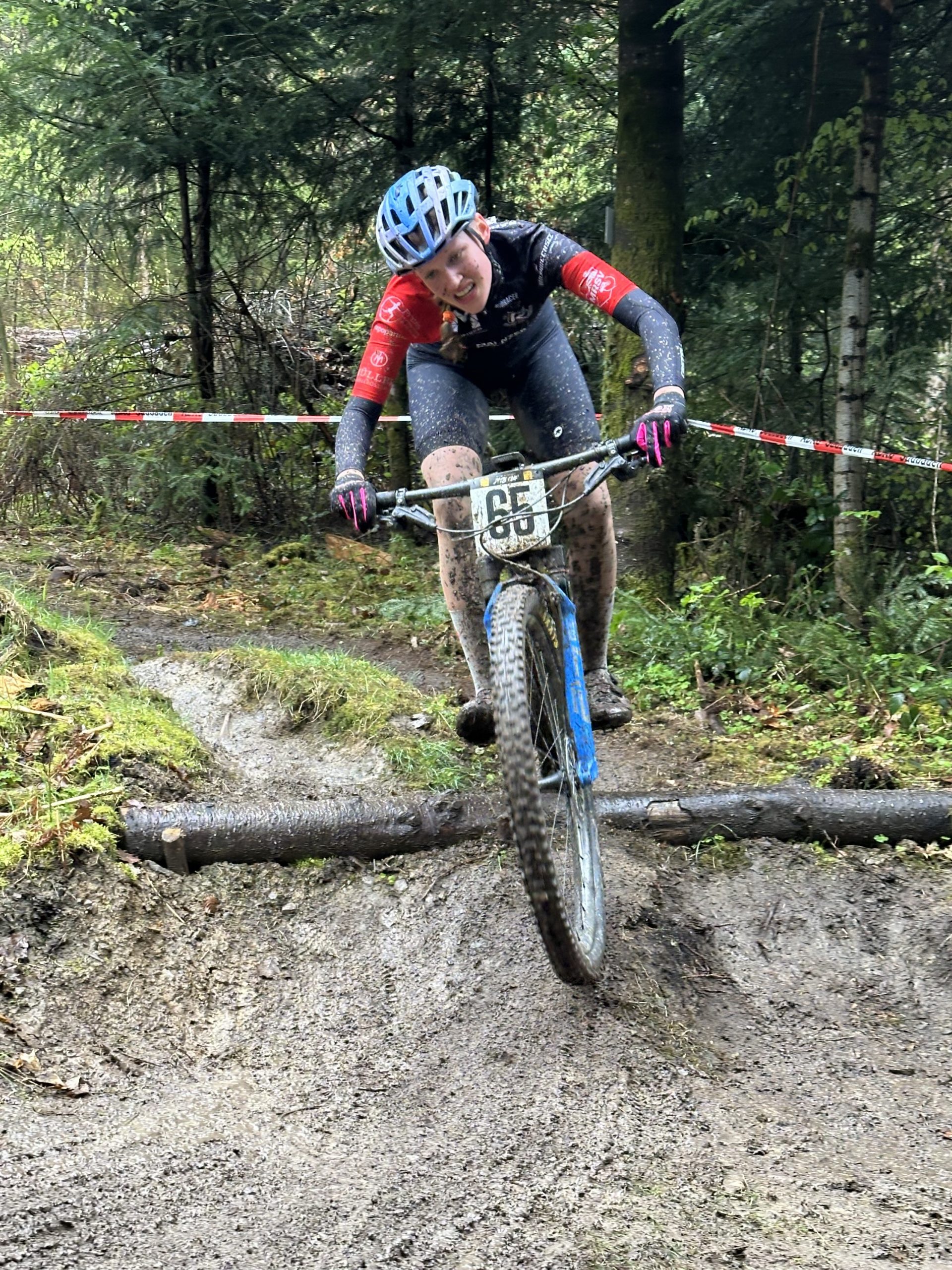 Am Sonntag hatte der Regen eingesetzt, so dass sich der MTB-Nachwuchs bei den XCO-Rennen durch den Schlamm arbeiten musste. Im Gedränge der ersten Runde vor einem Steinfeld stürzte Mats leider schmerzhaft und musste schon früh sein Rennen abbrechen.